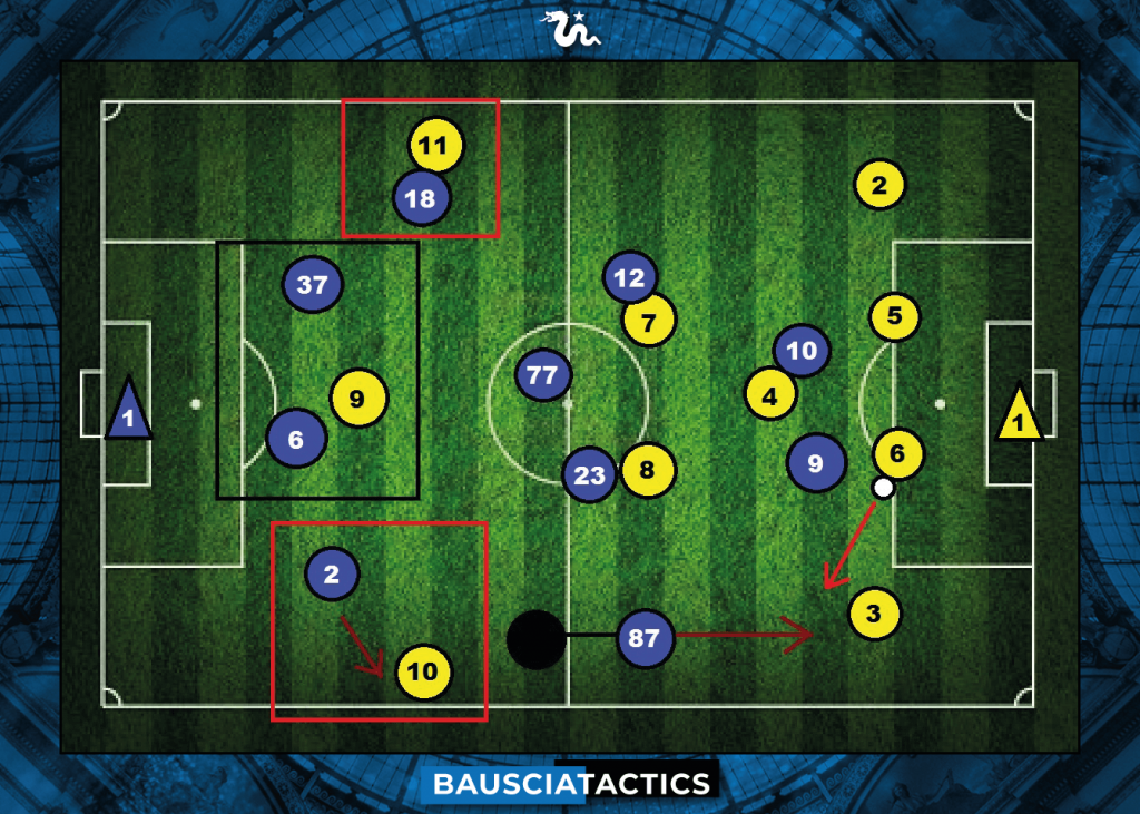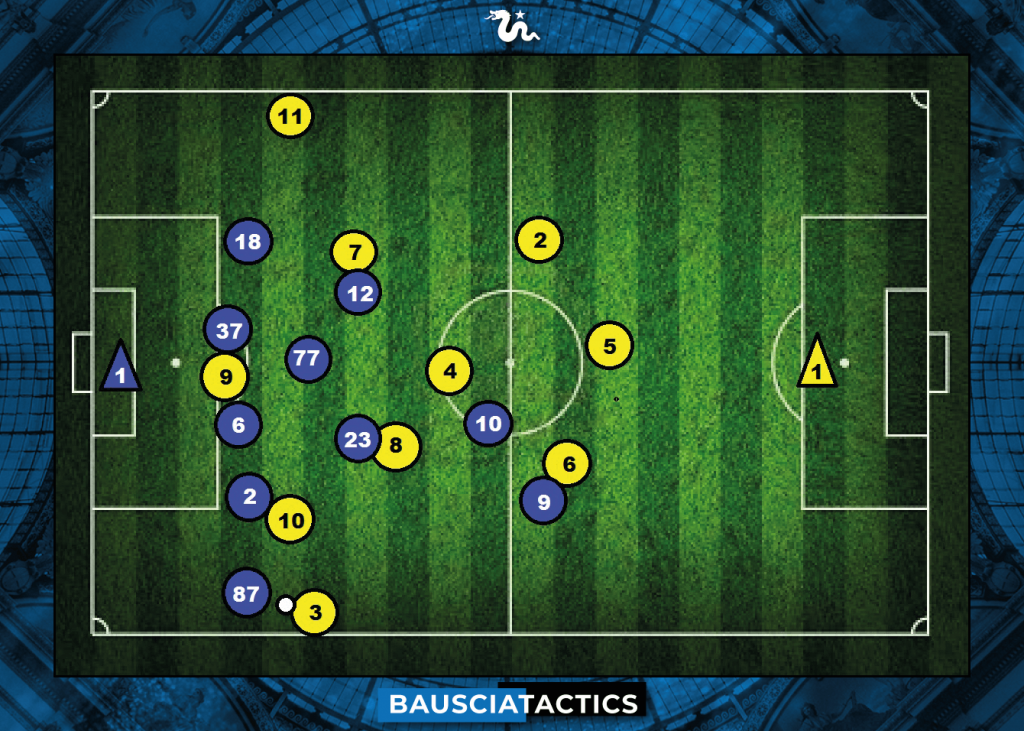 Quando l’avversario ha successo in costruzione bassa e passa allo sviluppo della manovra, l’Inter – fallita la pressione alta – ripiega all’indietro e difende di fatto a cinque, come mostrato nella figura 2.