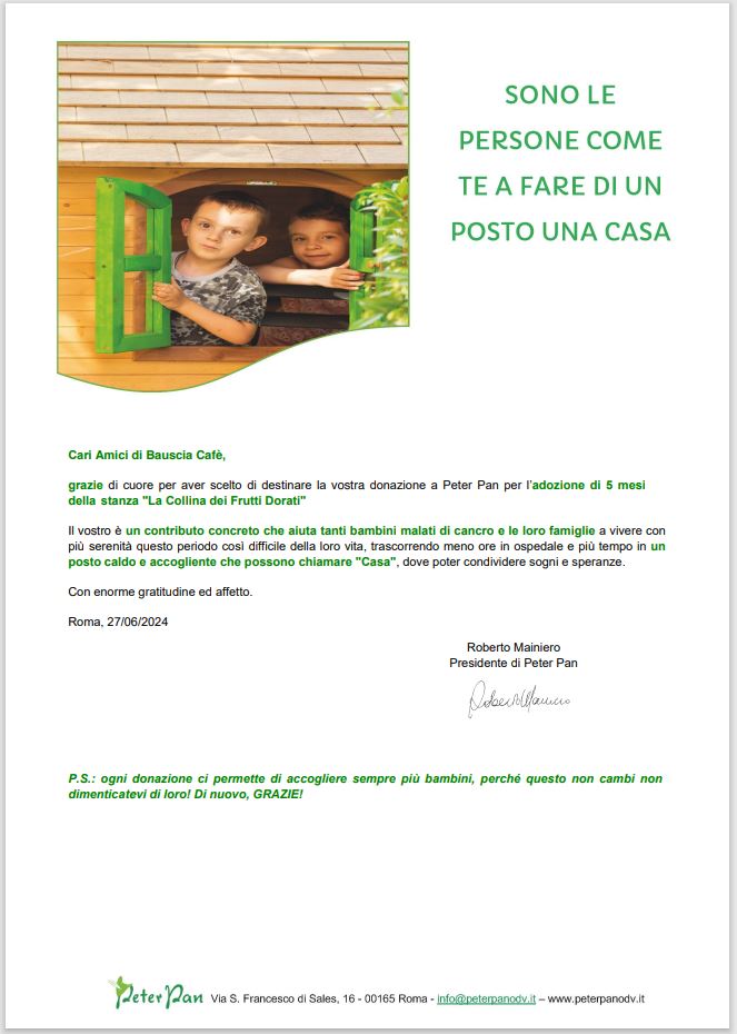 E’ con un immenso GRAZIE da parte di tutto Bauscia Café che abbiamo l’onore di raccontarvi che la cifra è stata interamente devoluta a Peter Pan OdV